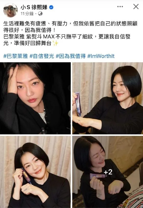 除了自拍照,小S还配文写道:“生活里难免有疲惫、有压力,但我依旧把自己的状态照顾得很好,因为我值得。”简短的一句话,道尽了她过去一年的挣扎与努力,也传递出想要走出悲伤、重新拥抱生活的决心。