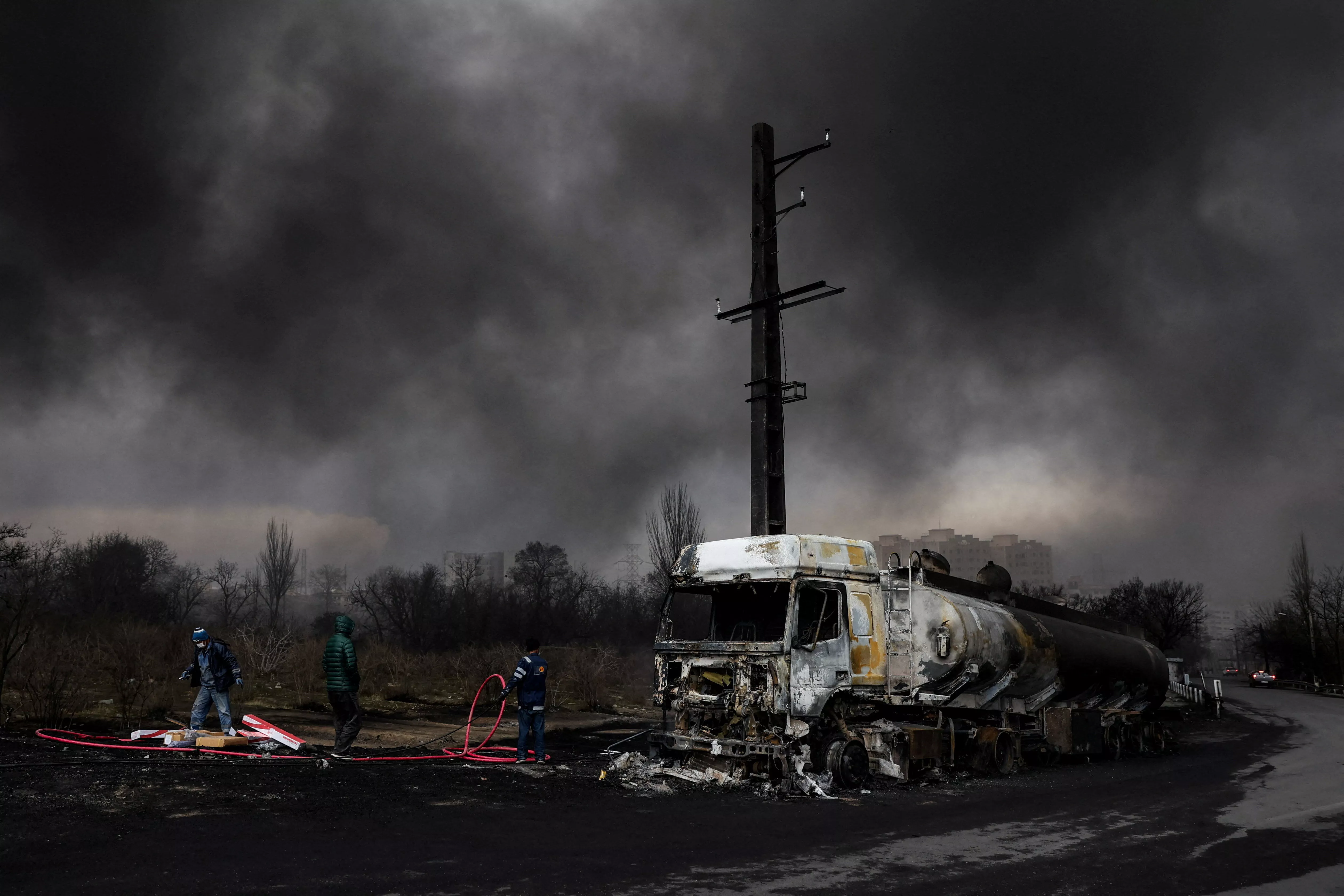 油库持续燃烧加油站配给 天空连鸟都消失