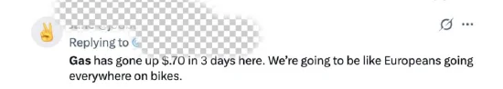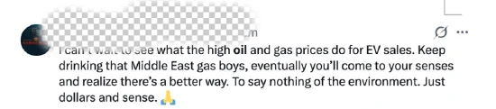 在推特上,有网友表示:“我倒是很想看看,高油价和高天然气价格会把电动车销量推到什么水平。你们就继续烧中东的石油吧,兄弟们,等油价高到一定程度,总会清醒过来,发现其实有更好的选择。更不用说对环境的好处了。单从经济账来看,这(电车)也是更划算的选择”。也有人表示:“再这么下去,我们都要像欧洲人一样,骑自行车到处出行了。”