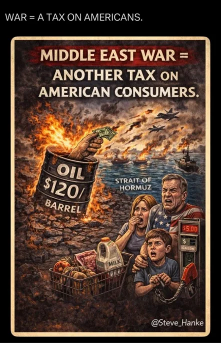 (图:约翰·霍普金斯大学应用经济学教授史蒂夫·汉克在社交媒体上称,中东战火是“对美国普通民众的加税”)