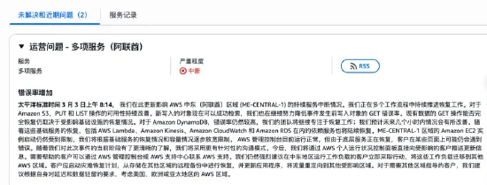但此轮冲突中,科技公司并非置身事外。例如,伊朗当地媒体称,亚马逊云计算服务平台(AWS)位于阿联酋的两座数据中心及巴林的一处设施遭到无人机袭击损毁。此后,《北美前哨》查询亚马逊云服务网站,显示在3月3日遭遇袭击后,导致多项服务中断。