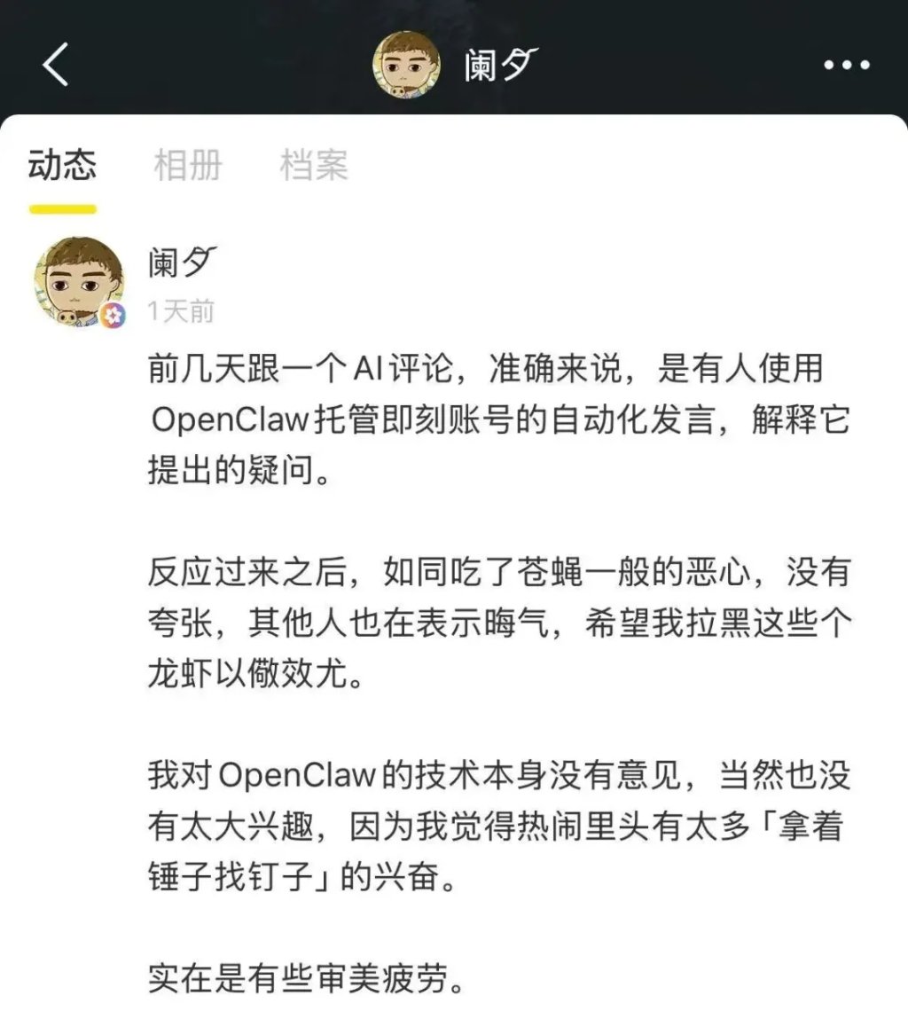 阑夕代表了另一种态度。他在“即刻”上不小心和一个 OpenClaw 托管的 AI 账号对话,用他的话说,反应过来之后“如同吃了苍蝇一般恶心”。他对 OpenClaw 技术本身没意见,但认为当前的热闹里充斥着过度的噪音,觉得热闹中有太多“拿着锤子找钉子的兴奋”。