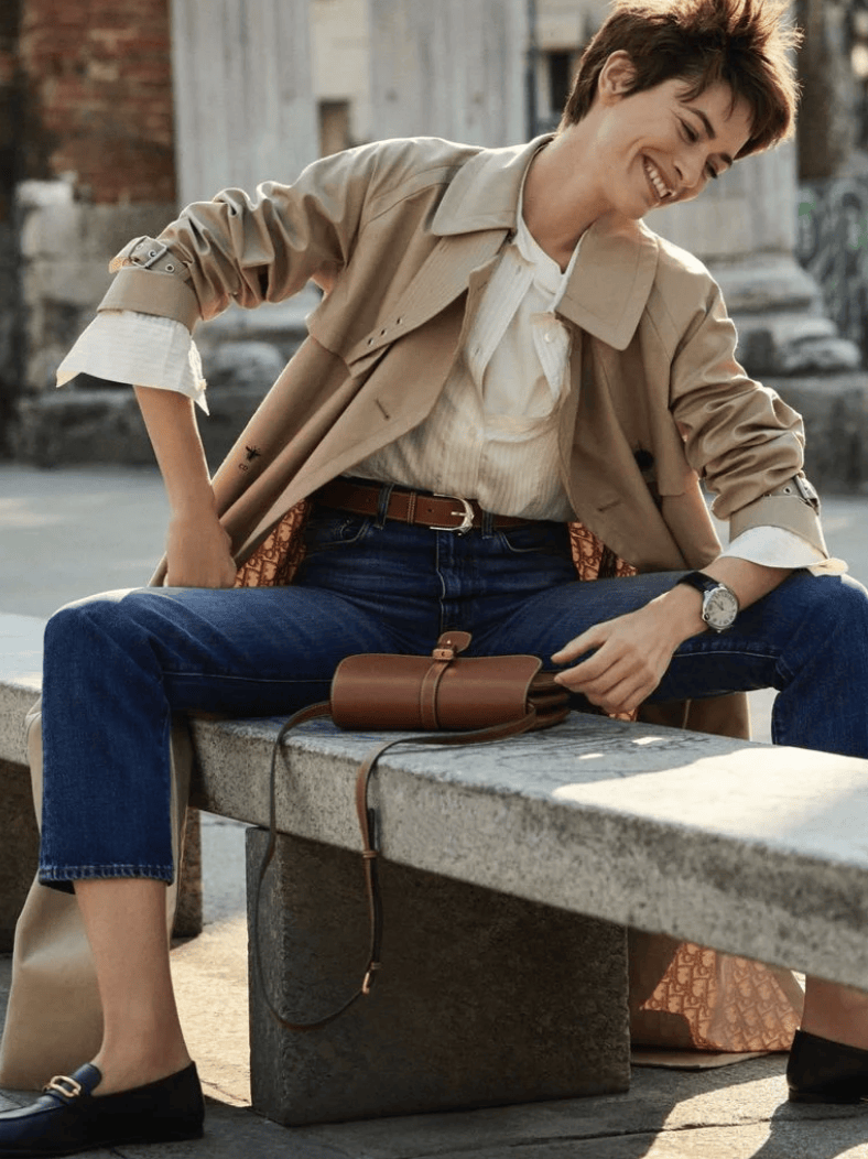 卡其色风衣,可以是优雅的也可以干练的,内搭一件白色衬衫,能让你瞬间变得更灵动自然,搭配一件蓝色牛仔裤,既放大了干练的休闲气质,也很显经典高级,搭配一双黑色乐福平底鞋,让你穿搭尽显大气且有力量。