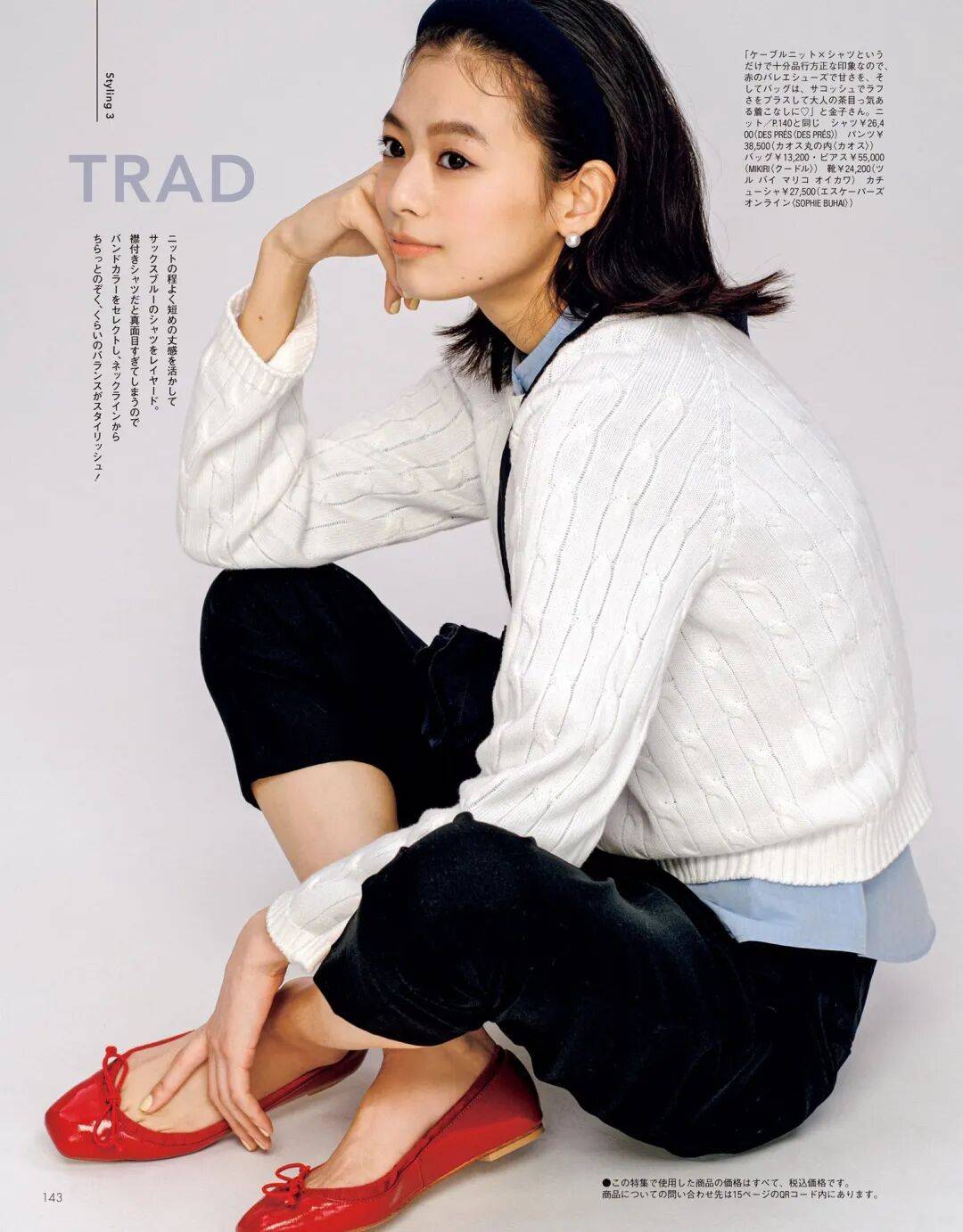 白色针织毛衣,白色有一种高级优雅大方随意的气质,内搭一件蓝色衬衫,不仅散发的大气还能够让穿者感到慵懒放松,搭配一件黑色七分裤,有漫不经心的高级感,穿上一双红色芭蕾平底鞋,有恰到好处的高级。