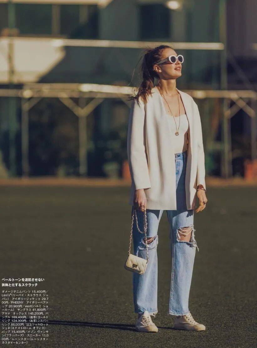 白色无领外套,展现出现代女性魅力,内搭一件白色裹胸立刻变得时髦有个性,搭配一件蓝色牛仔破烂裤,能穿出不同的花样穿搭,搭配一双运动平底鞋,能够完美展现你的个风格和态度。