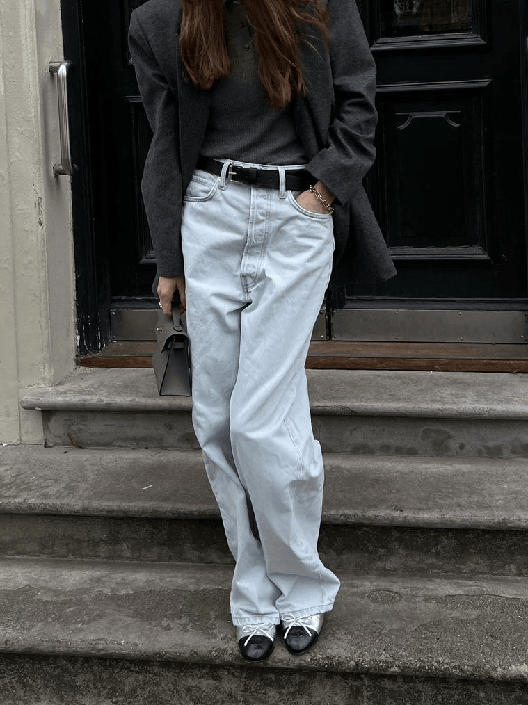 黑灰色西装外套,能够穿出大女人的高级干练感,内搭一件黑灰色针织打底,即显时髦又显气质,有一种大女人是神秘感,搭配一件浅蓝色牛仔阔腿裤,能形成精致的氛围感搭配一双拼色芭蕾平底鞋,穿出了简约而不简单的气质。