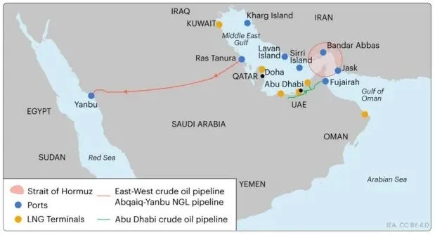 市场认为,中东原油出口还存在两条绕行路线,一条是通过沙特阿拉伯的东西向管道(East-West Pipeline)向位于红海沿岸的延布(Yanbu)及附近的穆阿吉兹码头出口,另一条是通过阿联酋的哈布山-富查伊拉石油管道(Habshan Pipeline)输送至阿联酋西海岸的富查伊拉以避开霍尔木兹海峡。