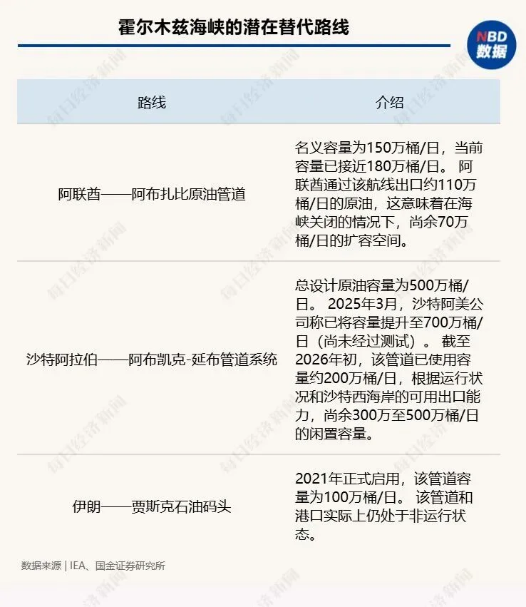 国金证券研报测算,当前海湾国家可调配的绕行出口能力仅为370万~570万桶/日,相较于1500万桶/日的常规过境量,缓冲作用极为有限,无法扭转全球供应收紧的趋势。