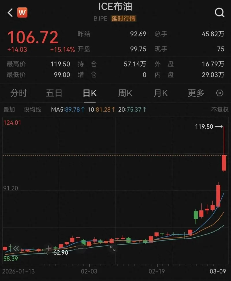 自2月28日美国和以色列袭击伊朗后的七个交易日,布伦特原油期货累计上涨了44美元/桶,累计涨幅高达60.9%。