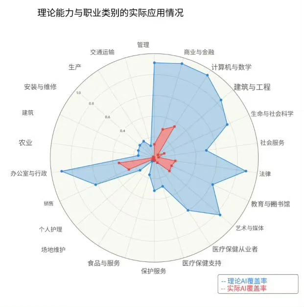 其实Anthropic的报告写得很清楚,AI在各行各业的理论利用率「蓝色区域」和实际利用率「红色区域」相差甚远: