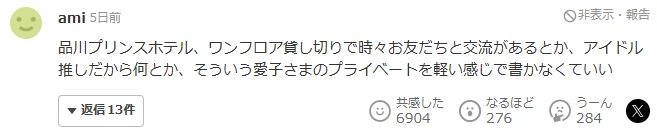 关于爱子公主的私人生活,例如“偶尔在包层的品川王子酒店与朋友聚会”,或是“因为是偶像粉丝所以如何如何”之类的传闻,请不要用这么轻浮的口吻进行描写。