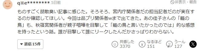 这篇文章让人感觉非常可疑。差不多该确认一下,所谓的“宫内厅相关人员”或“负责记者”是否真的存在了。这次甚至搬出了“品川王子酒店的相关人士”。