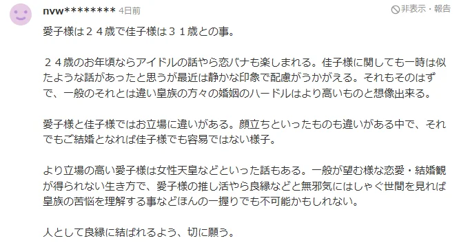 爱子殿下与佳子殿下地位有别,容貌气质也各不相同。即便如此,单就结婚一事而言,即便是佳子殿下似乎也绝非易事。