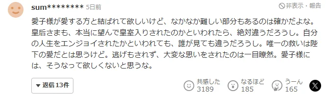 虽然希望爱子公主能与心爱之人喜结连理,但不可否认这确实挺难的。回想皇后陛下,如果问她当初是心甘情愿嫁入皇室吗?答案显然是否定的。如果问她是否享受了自己的人生?在旁人看来,答案恐怕也是否定的。或许唯一的慰藉,便是天皇陛下对她的深情吧。她从未逃避,其所经历的艰辛可谓一目了然。真心不希望爱子公主也走上同样的道路。
