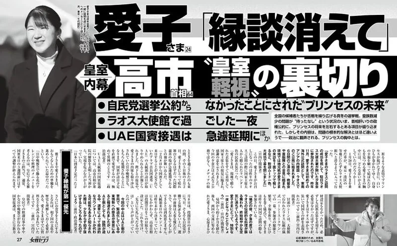 不久前更有传闻,高市早苗似乎有意沿袭安倍前首相的政治理念,计划推动爱子公主进行“政治联姻”,为其匹配一位出身旧宫家的驸马。背后的深层考量在于:若爱子公主未来登基成为女天皇,并诞下男性子嗣,皇位便可顺理成章地传给这位男婴,从而在保留女性天皇可能性的同时,确保皇位由男系继承。