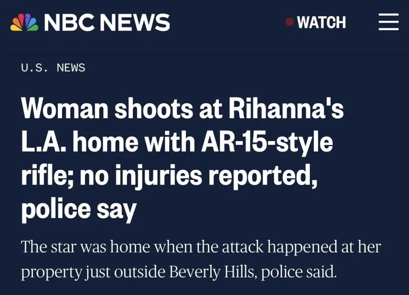 综合上述美媒报道,洛杉矶警方称,一名女子8日驾车来到蕾哈娜位于洛杉矶的住所,并使用一把AR-15步枪向其住宅射击。据消息人士透露,蕾哈娜的这处住宅遭到多发子弹射击,但子弹只击中了房屋外部,并未射入室内。