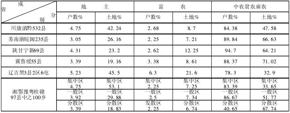 “据中南军政委员会土地改革委员会1950年编印的《土地改革重要文献与资料》统计,江西在1949年以前的原白区地主、富农共占人口的11.3%,占有 土地的44.6%;湖南1949年以前的丘陵地区,地主、富农占人口的9.2%,占有土地的64.1%;在山区则只占人口的7.6%,占有土地的 54.5%。从这个统计可以看出,在1949年以前江西的原白区,湖南的丘陵地区和山区(湘赣边区主要是山区),地主、富农的人口在7.6%至11.3% 之间,占有的土地(包括公田5.7%至14%)在44.6%至64.1%之间,即10%左右的人口占有土地的半数左右或稍多一点,并没有达到70%到 80%。从二三十年代到1949年以前,经过战乱和分化,虽然地权一般来说有所分散,但变化不会这么大,相差不会这么悬殊。出现这个差别的原因,恐怕主要 是二三十年代还没有对农村各阶级作出科学的划分,将一些不属于地主、富农的人划入了地主、富农之列,从而使地主、富农占有土地的比例显得高了。”(《对毛 泽东二三十年代农村各阶级土地占有状况的调查分析的重新研究》,郭德宏,党的文献,1989年第5期)