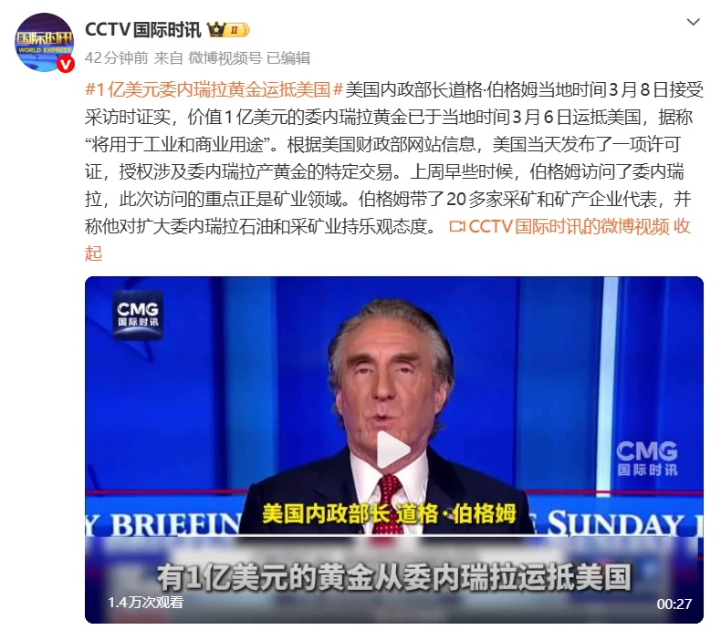 据报道,美国内政部长道格·伯格姆当地时间3月8日接受采访时证实,价值1亿美元的委内瑞拉黄金已于当地时间3月6日运抵美国,据称“将用于工业和商业用途”。根据美国财政部网站信息,美国当天发布了一项许可证,授权涉及委内瑞拉产黄金的特定交易。上周早些时候,伯格姆访问了委内瑞拉,此次访问的重点正是矿业领域。伯格姆带了20多家采矿和矿产企业代表,并称他对扩大委内瑞拉石油和采矿业持乐观态度。