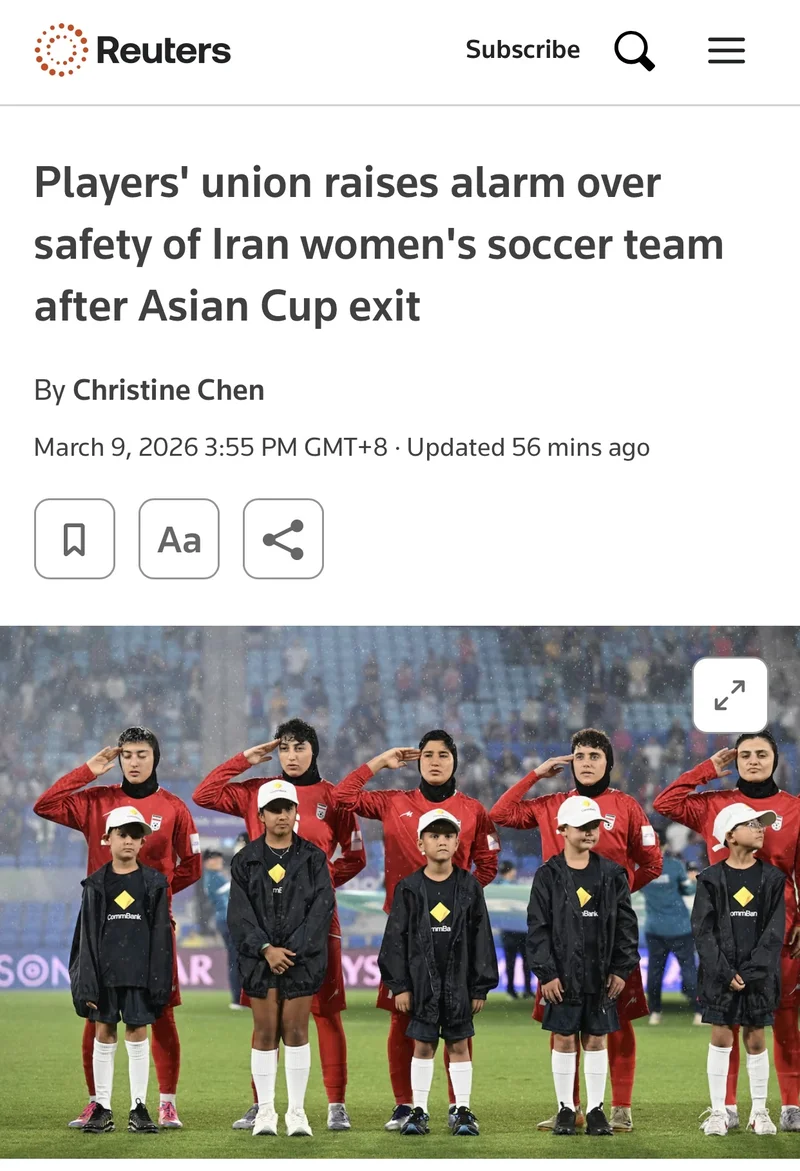 此前,伊朗女足队员因在亚洲杯比赛前拒绝唱国歌而被贴上“战时叛徒” (“wartime traitors”)的标签,目前她们正准备回国。伊朗女足在本届由澳大利亚主办的亚洲杯比赛中的比赛于上周末开始,而此时美国和以色列对伊朗发动空袭,导致伊朗伊斯兰共和国最高领袖阿里·哈梅内伊丧生。