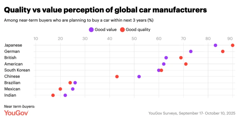 YouGov调研显示,日本汽车品牌在印度尼西亚消费者心目中的感知质量和价值方面仍稳居领先地位:90%的消费者认为其“质量上乘”,83%的消费者称其“物有所值”。德国、英国、美国、韩国、中国位居其后。