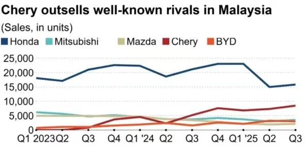 注释:本田、三菱、马自达、奇瑞、比亚迪在马来西亚的销量。来源:《日经亚洲》