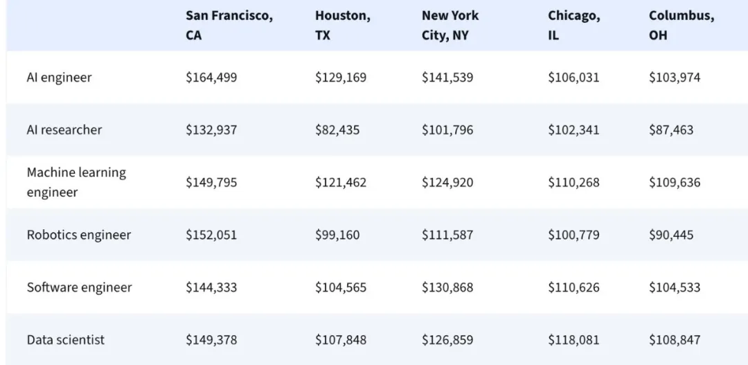 根据Glassdoor数据,美国不同城市人工智能相关岗位的平均薪资