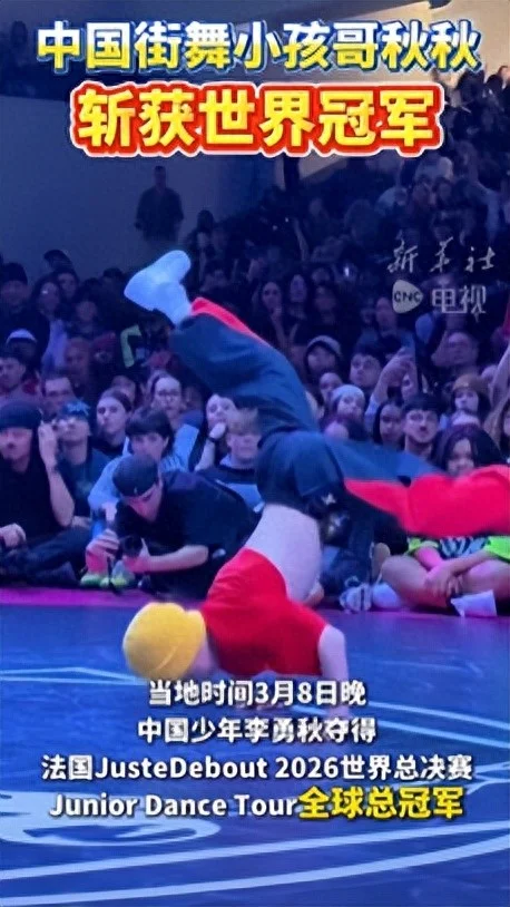 在刚刚落幕的法国Juste Debout街舞2026世界总决赛上,13岁的李勇秋夺得少儿组全球总冠军,成为第三位在该赛事少儿组夺冠的中国选手。同一片赛场上,张昕澜与张楚壹闯入机器舞成人组八强,刘杨峻淼跻身少儿组八强。从武术到蜀锦,从训练场到世界之巅,这群中国少年用利落舞步与创意表达,让世界看到中国传统文化的当代传承,更看到属于这个年纪的朝气与自信。赛后,李勇秋说:“比赛的时候在想我一定要赢,我的老...