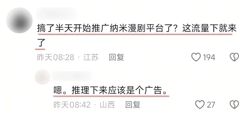 emmm……好好好,这制造全行业焦虑的一串串极限数据,合着就没啥是真的啊。给这一票影视圈的人干得,就跟屁股着了火一样,整宿整宿地睡不着。结果,就这???而网友们再一根据,@杨涵涵多次提及这片子,全程都是用纳米漫剧做出来的。总算是品过味了。网友:疑似是纳米漫剧的软广……