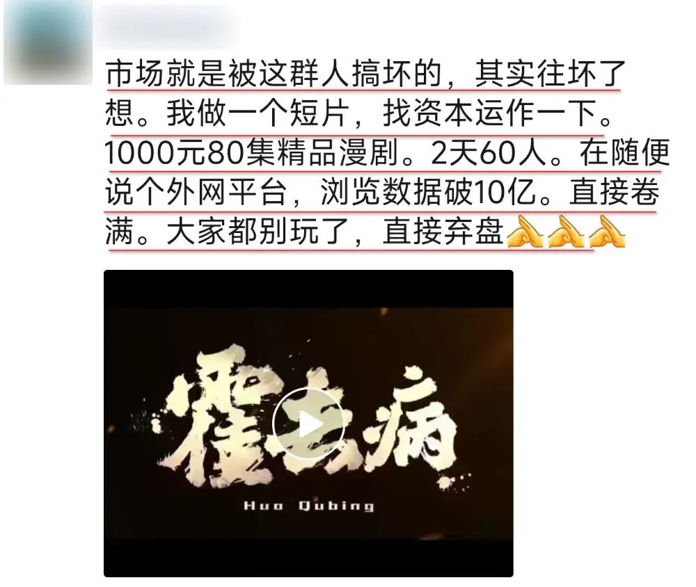OK,这么一对比,你是不是就会发现——3个人用5天时间,花3000元做出80集的AI漫剧《霍去病》,这样的创业故事就像很久很久以前,我们在《故事会》上读过的地摊成功文学?当然啦,有人也说了,这年头,市场上不缺魔幻的事情。但架不住有短剧圈的制作人半夜睡不着,出来较真,这笔账怎么算都算不对,打!假!PS:我朋友圈的某编剧老师,看完这部片子的心情 belike: