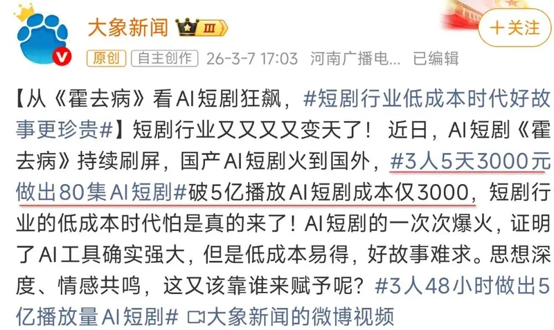 最近几个月,船长根本不敢睡觉,生怕第二天我一睁眼:What!又双叒变天了?!就比如说,周末,船长搁家里看到一条消息。说有个做AI漫剧的小团队,3个人花了5天时间,以成本3000元的价格做出来了一部长达80集的破5亿播放量的AI短剧。