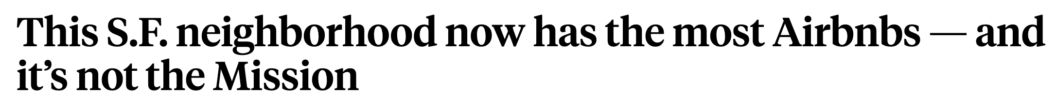 根据数据追踪机构 Inside Airbnb 提供并由《旧金山纪事报》分析的数据,在过去十年的大部分时间里,米慎区(Mission District)一直是旧金山Airbnb房源最密集的地区。但如今,最大份额的房源已经转移到了市中心(Downtown)、下诺布山(Lower Nob Hill)和田德隆区(Tenderloin)。