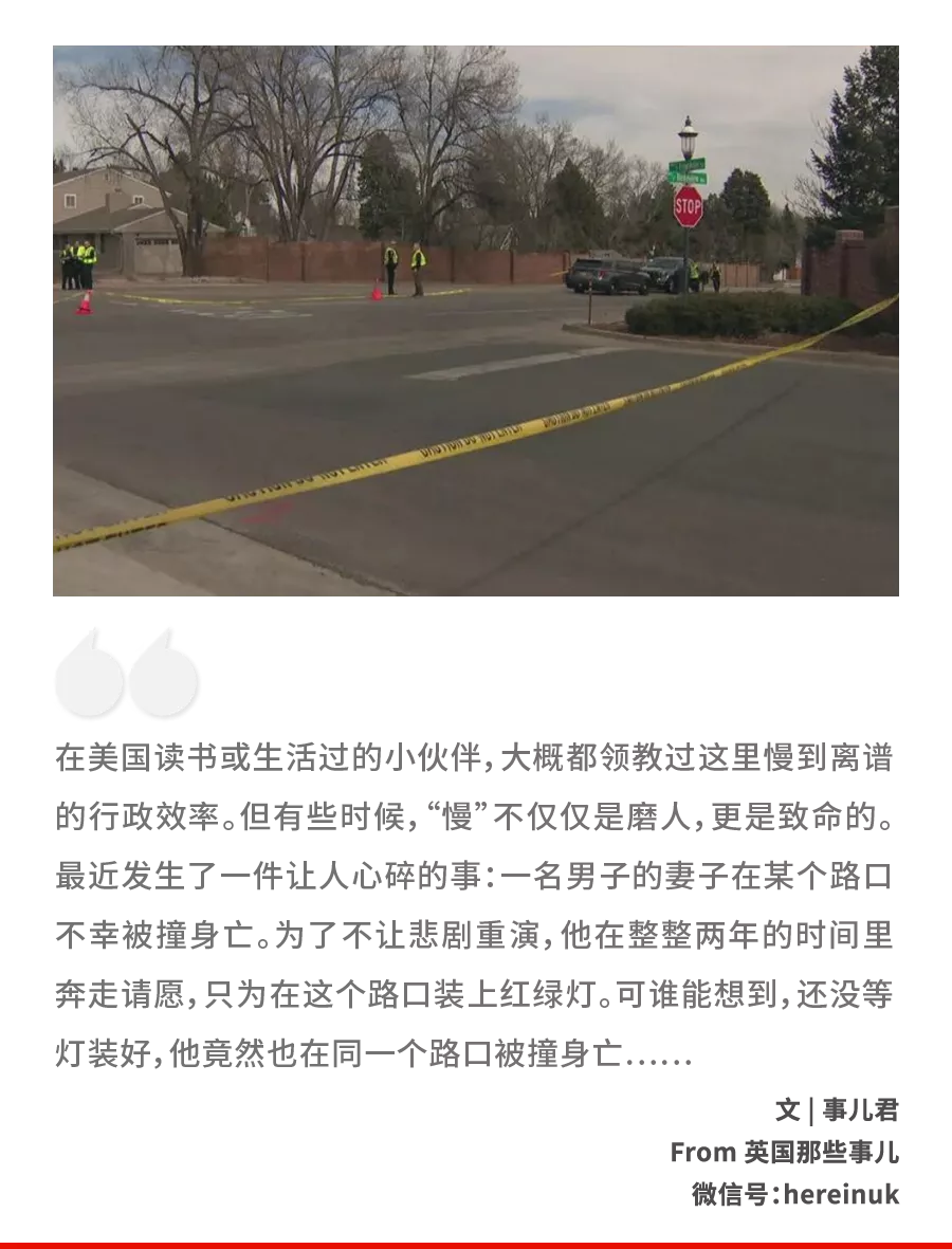 这次他们批准了一项红绿灯方案,理由是经过那个路口的车辆中,85%的车辆都超速了至少5英里/小时,已经符合安装红绿灯的标准,可实际上这项方案始终没能落实。