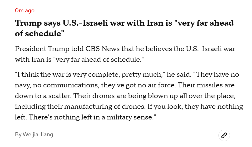据称特朗普说:“我认为这场战争已经基本结束,差不多了。他们(伊朗(专题))没有海军,没有通信系统,也没有空军。”据称特朗普还说,这比他最初预计的4到5周的时间框架“进展快得多”。这名记者还称,当被问及伊朗新任最高领袖穆杰塔巴·哈梅内伊时,特朗普表示:“我对他没什么可说的,完全没有。”特朗普声称“心中已有人选来接替哈梅内伊”,但没有进一步说明。