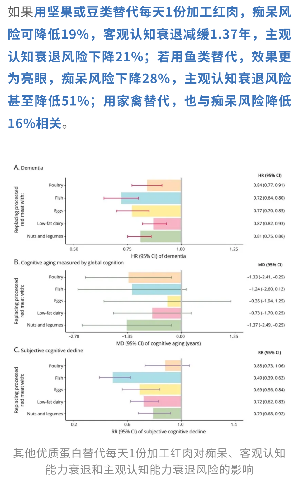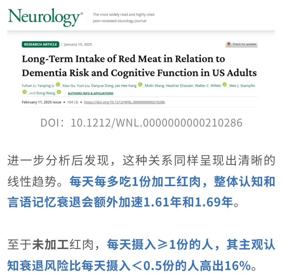此前,来自哈佛大学的研究团队发表于Neurology的一项研究[2]发现,红肉的摄入和认知衰退之间,存在着密不可分的关联。与每天摄入加工红肉<0.1份的人相比,每天摄入≥0.25份的人,痴呆风险升高13%;不仅如此,他们的整体认知和言语记忆衰退速度也分别加快了0.82年和0.85年。
