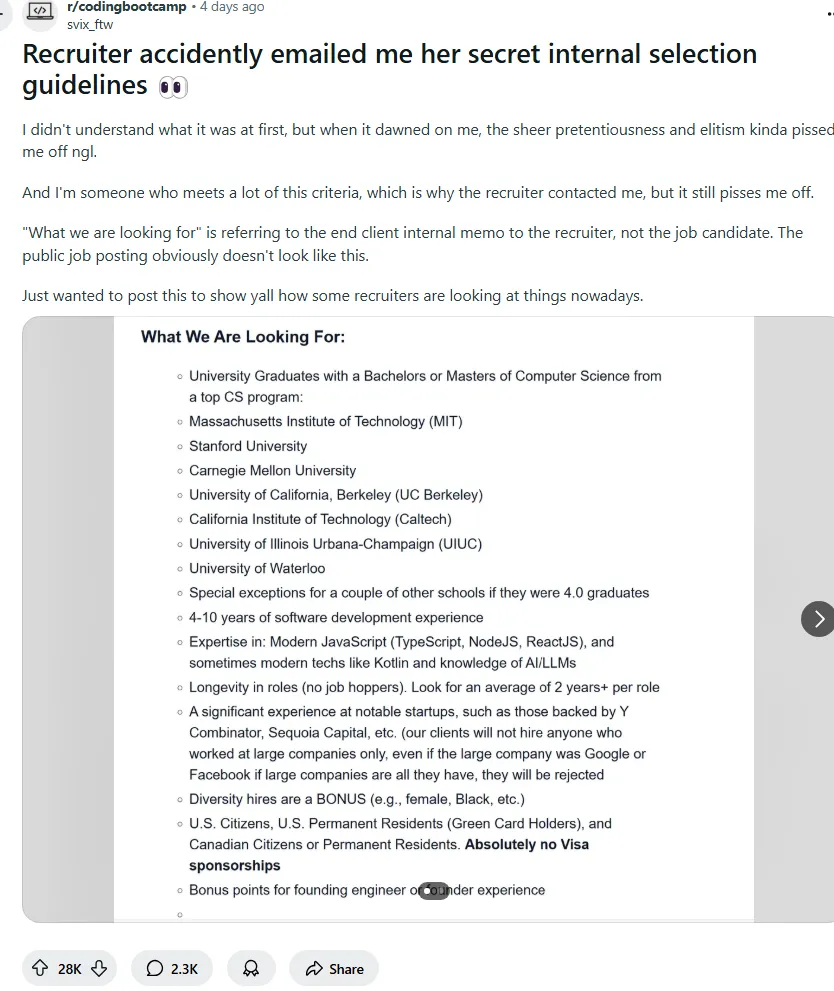 一位美国网友在 Reddit 上分享了一段招聘软件工程师的内部文件截图,揭开美国大厂招聘程序员时不为人知的一面。
