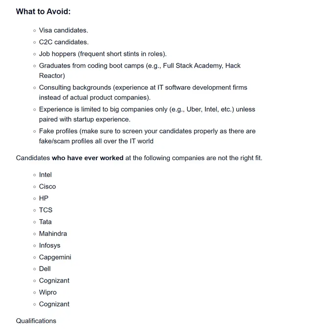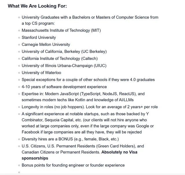 一家美国企业想要委托猎头招聘程序员,在内部文件里明确列出了What We Are Looking For和what to avoid两块。