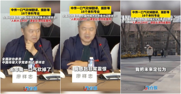 据3月8日报道,全国政协委员、中国传媒大学党委书记廖祥忠声称,“去年我一口气砍掉了16个本科专业方向”、“我把未来定位为”、“我现在正在做课堂革命”、“我说怎么讲好一堂课”。