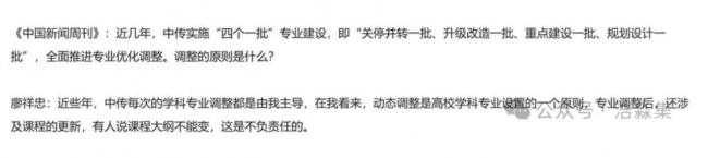 这不是廖祥忠第一次用这种口气说话,廖祥忠于2024年9月份接受《中国新闻周刊》专访《廖祥忠:中传再迎“冲顶”战》时称,“中传每次的学科专业调整都是由我主导”。