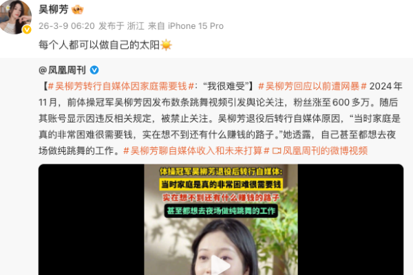 3月8日,前体操世界冠军吴柳芳接受《凤凰周刊》专访时首度回应2024年“擦边”风波。她坦言,当时母亲重病,家中背负40万元债务。作为长女,养家、还债及供养弟弟学费的重担压在她身上。