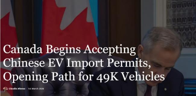 这一政策由加拿大全球事务部于2月25日通过进口管制通知公布。随后,加拿大边境服务局发布海关通知,确认针对中国制造电动车的100%附加关税已被取消。