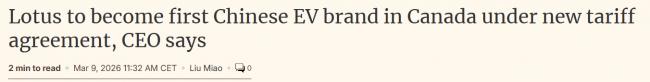 全球知名豪华汽车制造商莲花(Lotus)首席执行官冯擎峰近日表示,公司有望成为首个在加拿大市场销售的中国电动车品牌,并将适用6.1%的关税。同时,由于中东地区冲突持续,公司已暂时暂停向中东出口部分车辆。