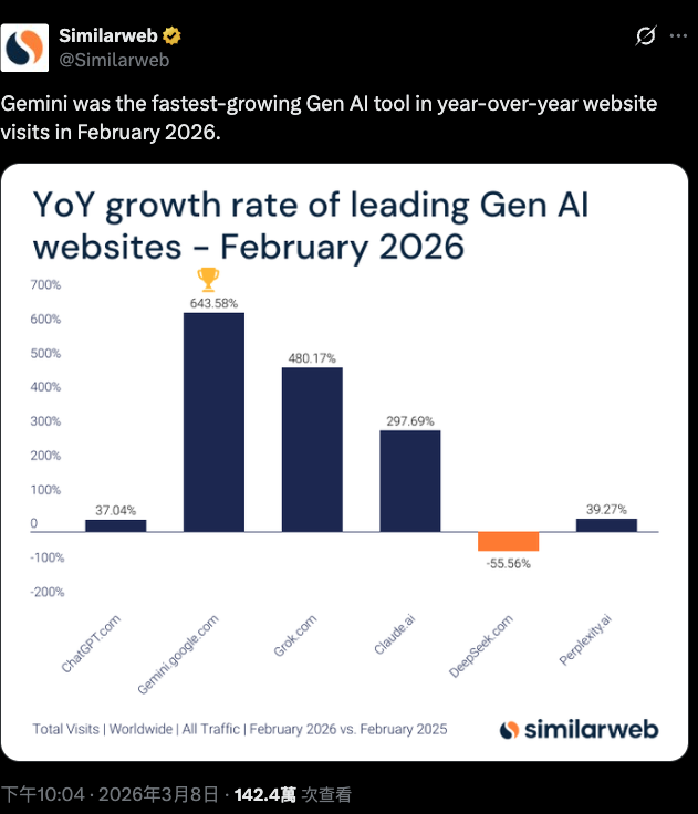 SimilarWeb 透过统计2026 年2 月与2025 年2 月,各大AI 工具的“网站”流量,发现Gemini 一举成长了多达 643.58%,遥遥领先其他竞争者,其次是X 平台的Grok 与Claude,成长率分别有 480% 和297% 同样十分惊人。