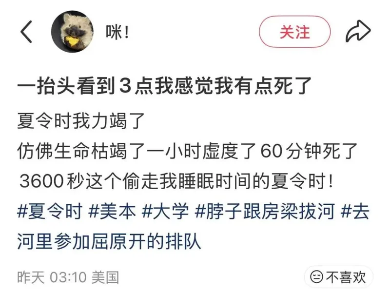 “仿佛生命枯竭了一个小时虚度了 60 分钟死了 3600 秒这个偷走我睡眠时间的夏令时!”