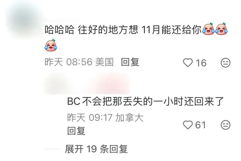 但也有 BC 网友表示:我们被偷走的这一个小时再也不会回来了!