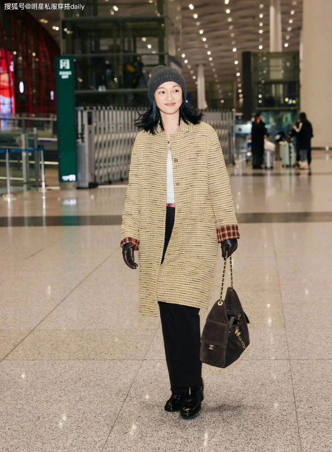 早春天气微凉,周迅身穿一件米黄色粗花呢大衣,自带优雅、复古、高级感!内搭白色打底衫增加了清爽和柔和感。