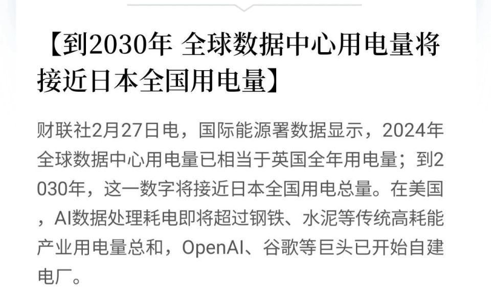 国际能源署预测,到2030年,全球AI用电量将增加一倍以上,接近1万亿度,相当于日本全年的用电量。