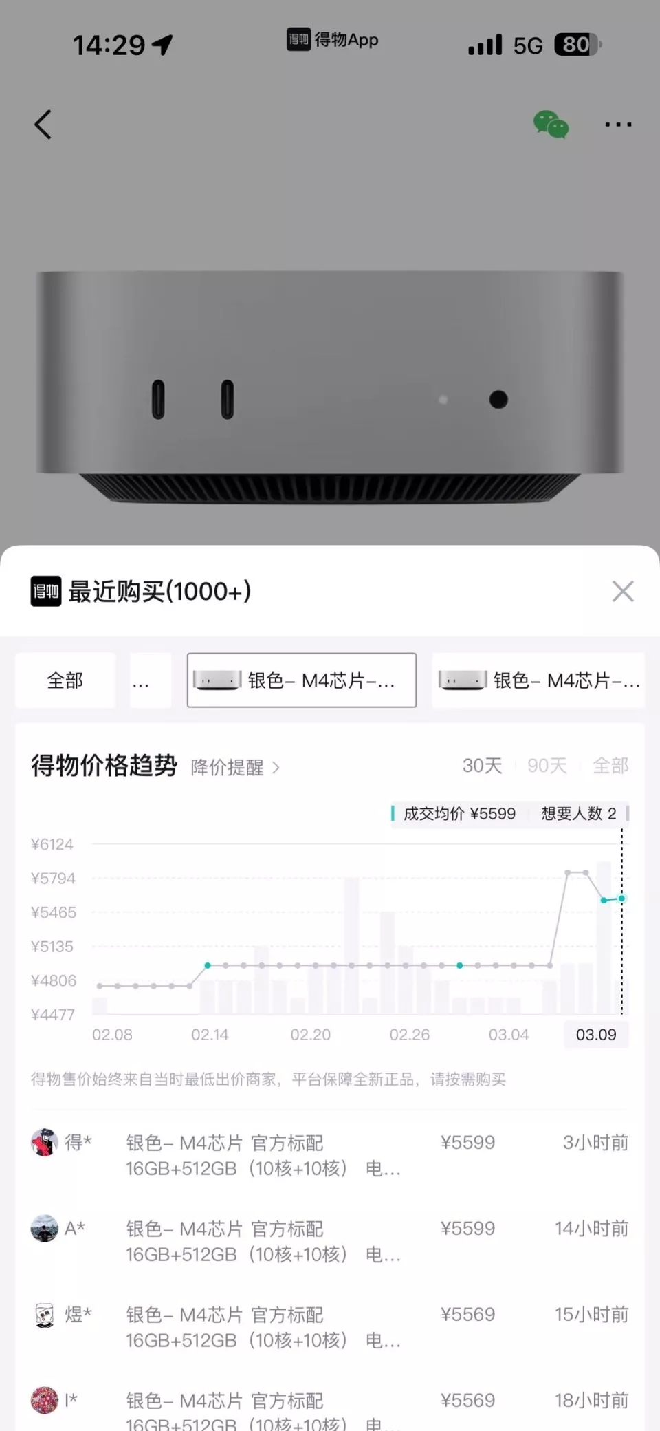 得物App数据显示,Mac Mini M4主机多个型号已在得物App上售罄,最近一周Mac mini M4价格最高增长649元(13%)。