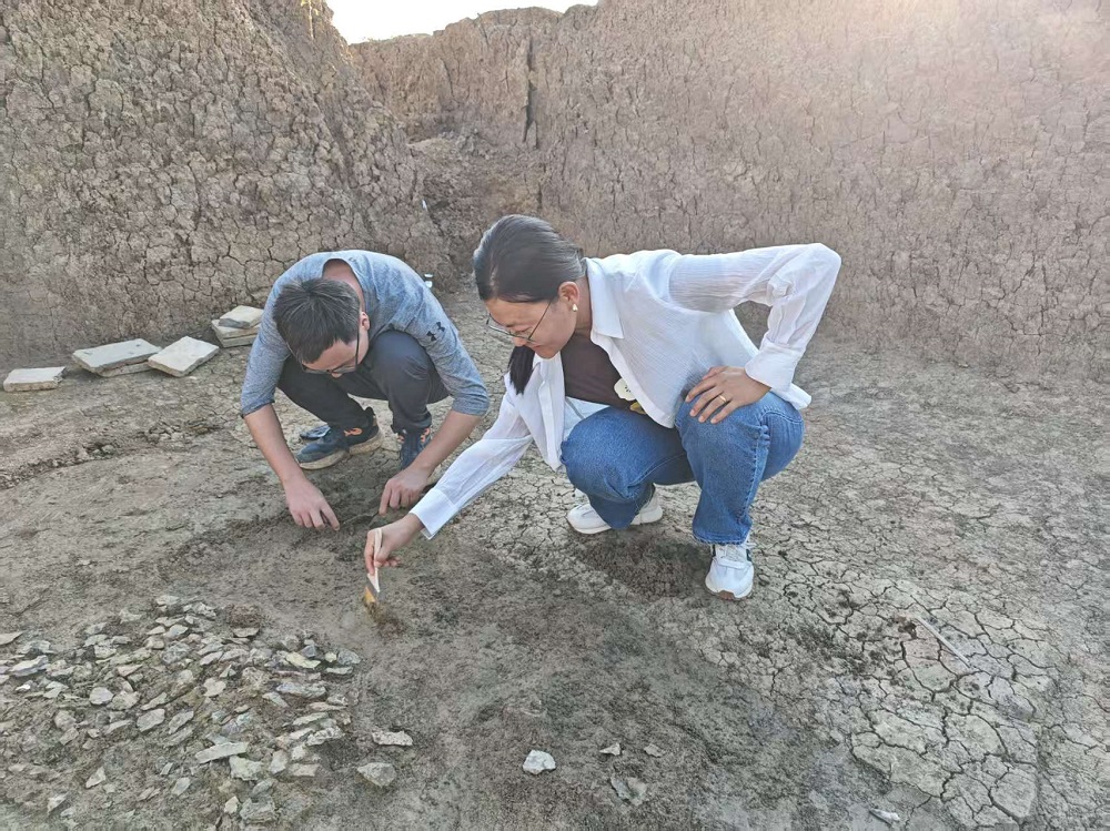 杨石霞(右)和团队成员在新发掘的遗址考察。受访者供图