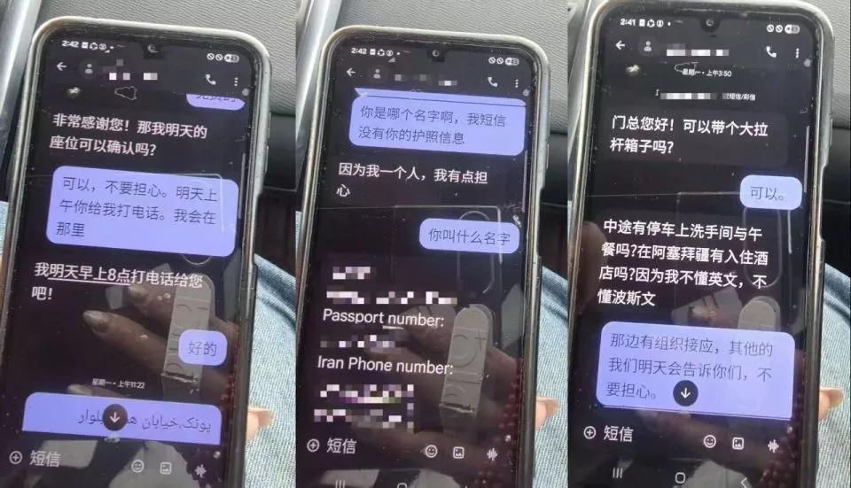 几乎每分钟都有电话、短信进来或者出去。门海燕写了满满的几页纸。有人不停发来短信,门海燕的收件箱里,英语、波斯语和中文夹在一起:“可以带个大拉杆箱子吗?”“中途有停车上洗手间吗?”“阿塞拜疆有入住酒店吗?因为我一个人,不懂英文,不懂波斯语。”“车费是多少?”