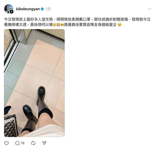 根据梁茵在社交媒体发布的图文,她当时正走在香港(专题)街头。照片中她声称素颜出行且戴着口罩,但打扮极其惹眼,上身是浅色超短连身裙,下半身搭配黑色长靴。她大吐苦水描述走光过程,表示当天敏锐察觉周围有大量路人用异样眼光盯着她看。